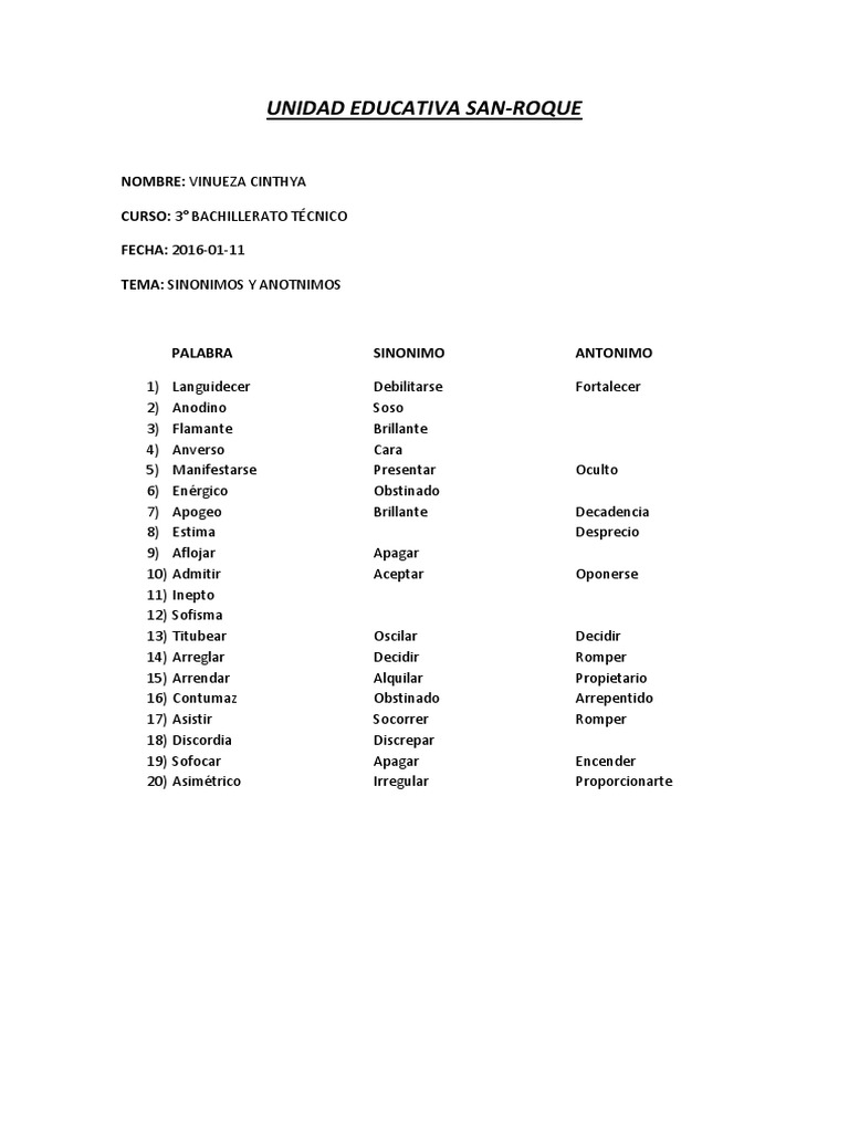 Pueba De Sinonimos Y Antonimos Esciela
