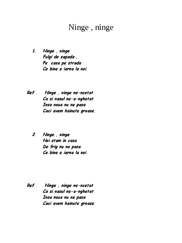 Ninge ninge noi stam in casa de frig nu ne pasa ce bine e iarna la noi. Ninge ninge fulgi de zapada pe casa pe strada ce bine e iarna la noi. Ninge ninge ne ncetat ca si nasul ne a nghetat insa noua nu ne pasa caci avem hainute groase.